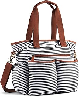 SFGHOUSE Sac à langer en toile à rayures pour maman et papa - Grand sac à bandoulière multifonction avec matelas à langer - Noir