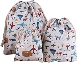3Pcs Sac de Rangement en Toile de Lin Pratique Sac à Bagages Impression Fleurs Mignonne Organisateur des Voyage Sac Pochette Grande Capacité avec Cordon
