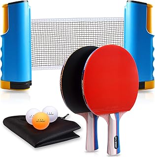 Tencoz Raquette de Tennis de Table, Set de Ping Pong Portable - 2 Raquettes + Rétractable Filet de Table Tennis + 6 Balles pour Intérieur Extérieur